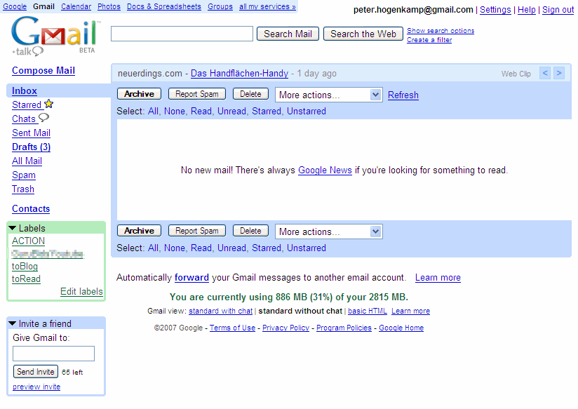 „Archive“ fällt in GMail weg, da eh alles weggeklickte im Archive ist und man statt mit Foldern mit Labeln arbeitet. „Hold“ habe ich bisher noch nicht gebraucht, ich war am Mittwoch noch in der Phase, wo man mit der groben Kelle sortiert. (Habe für die ersten 500 Mails zwei Stunden gebraucht und dann deutlich das Tempo angezogen. Irgendwann wird man richtig sauer auf jeden, den einem jemals gemailt hat.)